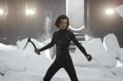 That isn't to say there aren't some good scares and plenty of the zombie-killing action in the flick... I would just like to have a little more story along with the mayhem. Jovovich once again shows herself to be the Queen of Green-screen Fu--and the final showdown in frozen northern Russia is quite exciting, but the film really needed more of a story that four lines written on the back of one of Paul W.S. Anderson's business cards.